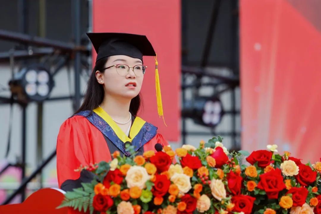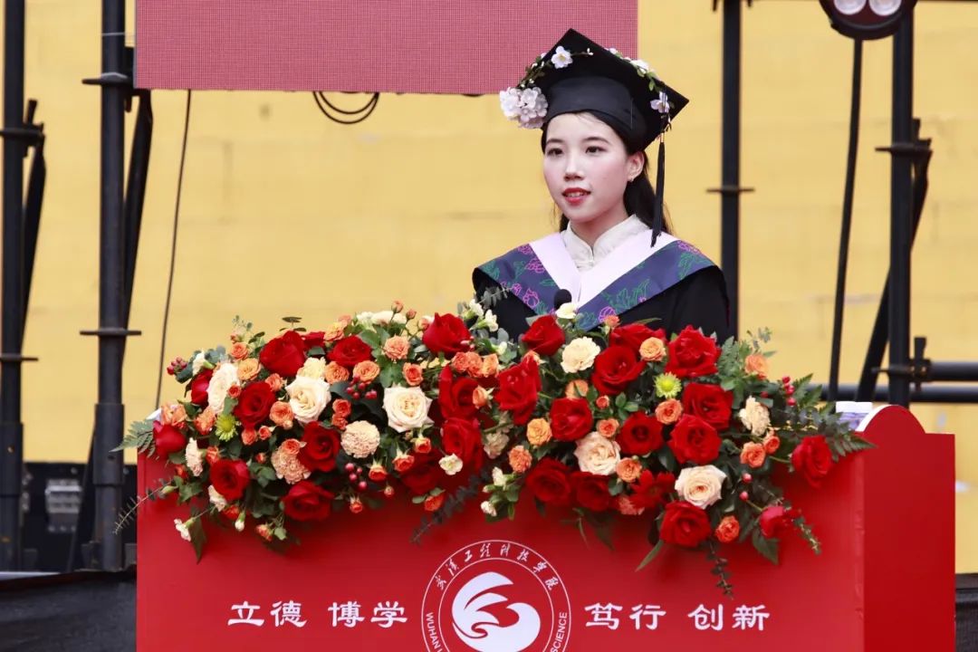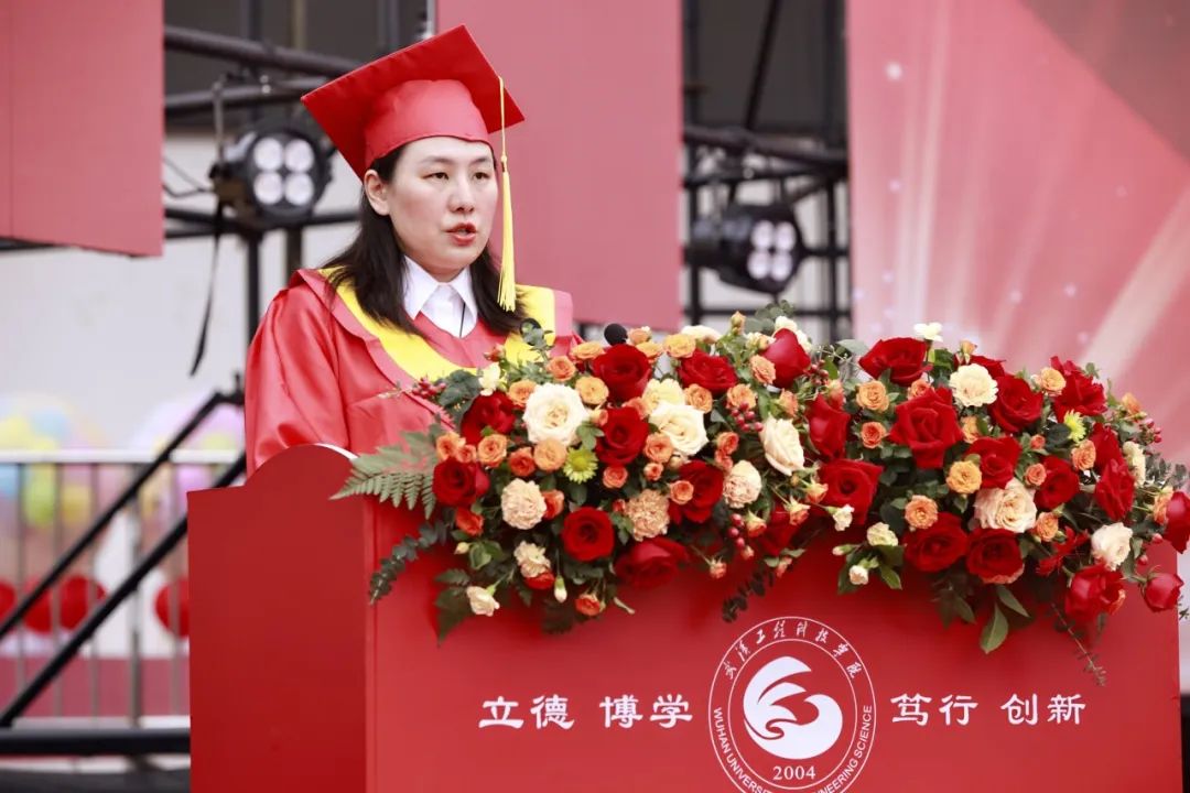 2021级小学教育专业张茗作为毕业生代表发言。她代表毕业生们向领导老师与家长表达崇高的敬意与真挚的感谢。她表示,从青涩懵懂到成熟坚定,每一步成长都离不开母校的悉心培养,在武工院四年的学习与历练,正是赋予我们每个人未来无限可能性的桥梁。她回忆这四年的求学生涯,有新生集体生日会的温暖,有奔忙学科竞赛时的艰辛,有志愿服务时对偏远地区儿童的心酸,更有毕业时沉甸甸的收获与不舍。她希望,未来无论在何方,都能以武工院人的精神底色,书写无愧于时代的精彩答卷。