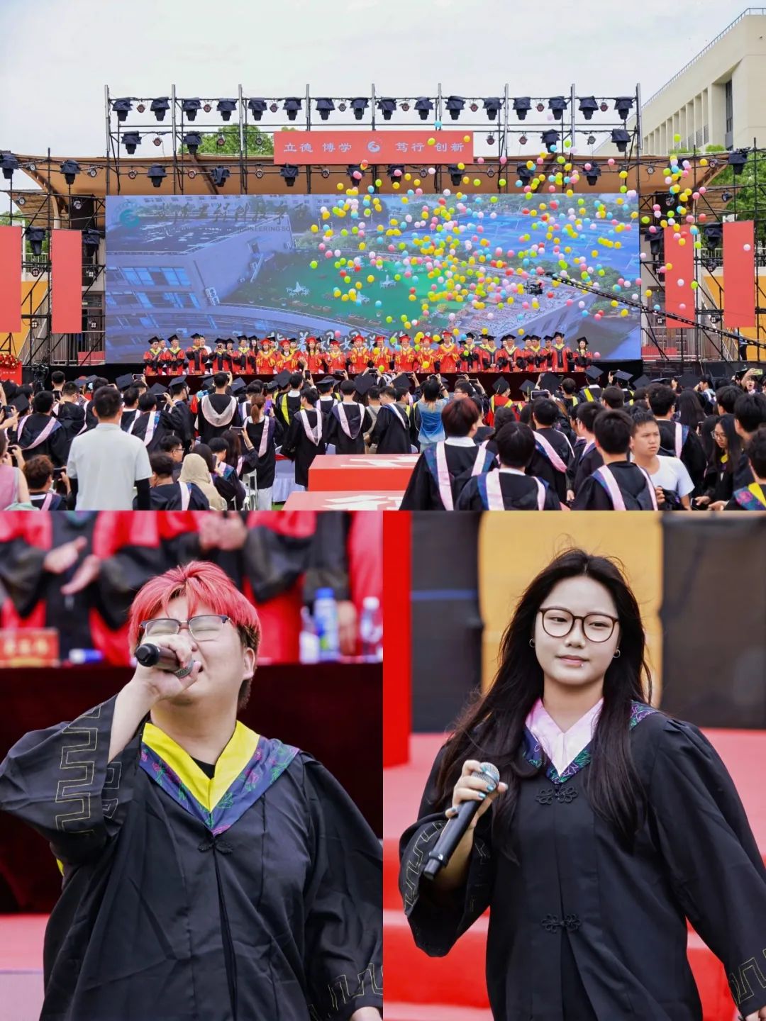 现场还为毕业生们准备了欢送节目。随着《海阔天空》《追光者》《离别开出花》的旋律响起,现场掌声雷动,氛围温馨,同学纷纷合唱。在悠扬的歌声中,大学生涯的点点滴滴一幕幕闪过,满怀对未来的期待。现场还放飞了气球,五颜六色的气球承载着学校对毕业生们最美好的祝愿飞向蓝天。
