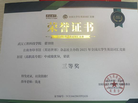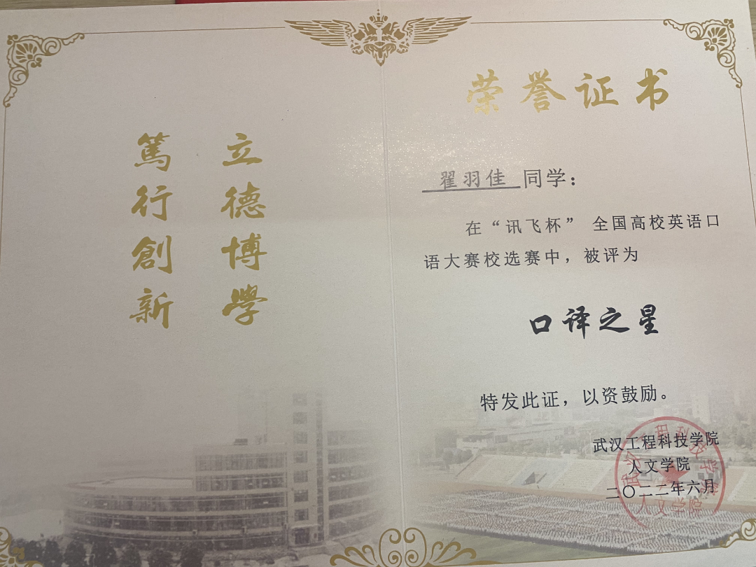 2020年,翟羽佳以专科生的身份踏入大学校园。初入校时,她也曾陷入“混日子”的心态,但骨子里的不甘很快将她唤醒。翟羽佳告诉自己,这绝不是终点,于是她开启了与各类竞赛相伴的大学时光,抓住每一次提升机会。她积极参加老师推荐的比赛,无论是演讲还是口语赛事,她都会提前数周精心准备。2021年“外研社·国才杯”全国英语演讲大赛让她学会了结构化表达、2022年“讯飞杯”口译之星比赛帮助她提升了临场应变能力……在一次又一次的比赛中收获了一个又一个的成果后,翟羽佳确信:站上舞台,才能被看见。