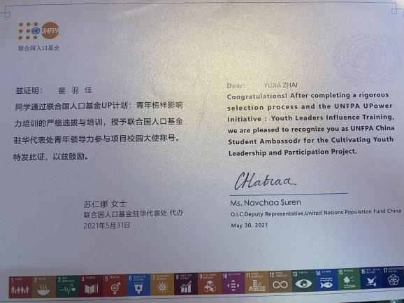 如果说清晰的职业目标是翟羽佳持续努力的内驱力,国际教育学院就是她梦想的“孵化器”。国际教育学院的外教课程、国际赛事和校企合作项目让翟羽佳意识到职业发展需要主动创造机会。在2021年参加联合国人口基金“一带一路”校园大使选拔时,她用英语向外国评委阐释中国青年责任,这种实战经验远超课本,给予她更大的挑战。“没有平台托举,个人努力会事倍功半。”翟羽佳感慨道。