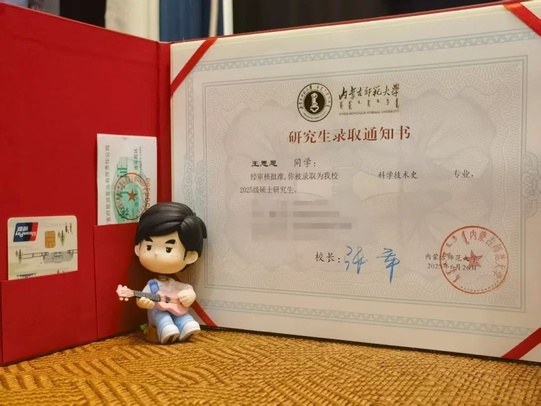 他的第一志愿是西北大学,顺利进入复试后却未能如愿录取。在经历短暂的失落之后,他积极准备调剂,最终进入内蒙古师范大学,并在复试中脱颖而出。尽管学校层级有所不同,但该校的科学技术史专业在全国具有较强的学术优势。“回过头来看,或许这正是一次‘因祸得福’的转折。”他这样说道。