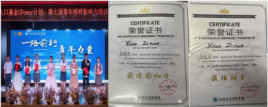 在英语学科上,她斩获全国大学生英语词汇竞赛三等奖、外研社·国才杯英语辩论特等奖等,并取得英语六级与教师资格证;在跨文化实践中,她获得了联合国人口基金一带一路青年领导力选拔优胜奖,入选青年榜样影响力培训并摘得“最佳影响力”“最佳辩手”,还获驻华代表青年领导力项目校园大使称号,逐步靠近职业目标。肖紫诺始终热忱投身社会实践,从湖北省农业博览会到圆梦计划石家庄队,从暑期三下乡到临沂市青鸟计划,多次获“优秀志愿者”“先进个人”称号;在校园文化中,江城之春文艺汇演包揽优秀个人与最佳人气奖,摘得人文学院文化月最佳舞蹈奖,展现多元活力。在综合能力上,她在职业生涯规划大赛上展获三等奖,在“讲好江夏故事”等竞赛屡获佳绩,并荣获五四青年奖章学习进步奖、国际精英单项奖,更以优异表现获评武汉工程科技学院优秀毕业生。